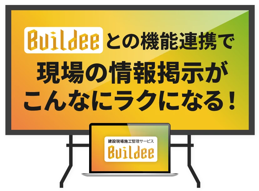 BANKENサイネージを朝礼看板などにご導入いただくことでBuildee調整会議にご登録いただいた「ゲート予定」や「揚重機予定」、「現場配置図」などの情報を自動連係しサイネージ投影することが可能になります。