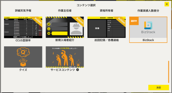 - 「BizStack」コンテンツのURL、メールアドレス、パスワードを設定することで、サイネージ画面に「BizStack」のダッシュボードが表示されます。